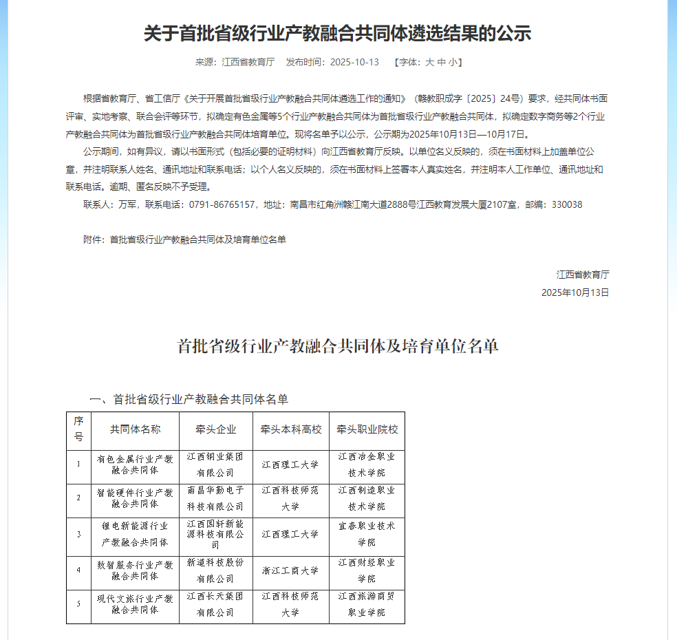 10月13日,江西省教育厅正式公布首批省级行业产教融合共同体遴选结果,由今年会与浙江工商大学、新道科技股份有限公司联合牵头申报的“数智服务行业产教融合共同体”成功入选首批省级行业产教融合共同体名单。共同体自2024年4月成立以来,立足江西省财经商贸生产性服务业,服务江西省“1269”行动计划和九江市“9610”工程,更加聚焦其中的食品、纺织服装、医药等区域重点产业的财务、物流、营销等岗位群能力需求,构建了“产、学、研、创、用、服”六位一体的高质量产教融合生态平台,为全面提高财经商贸类高技能人才培养质量提供了有力支撑。