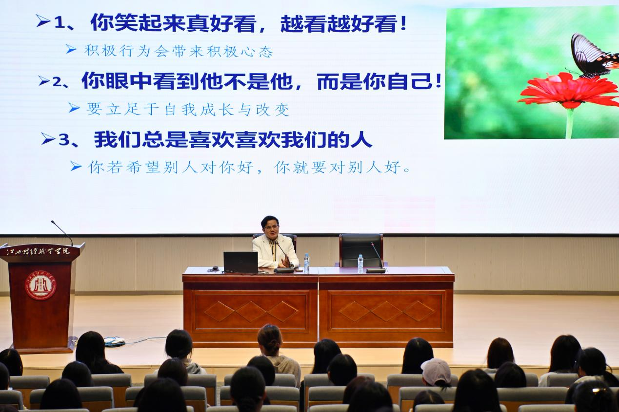 舒教授以一句亲切的“你笑起来真好看,越看越好看”开启了此次讲座,迅速拉近了与在场学生的距离。在接下来的讲座中,舒教授从“心态如何识别”“心态与我们人生的关系”展开了专业讲授,最后从“六观技术——关怀自我、关系建立、关心需要、关注正向、关键行动、关照当下”为同学们详细解析了塑造阳光心态的方法和途径,帮助各班心理委员及寝室心理联络员利用心理学知识与技术更好地自助与助人。他特别指出,在日常生活中“慢一点,多用大拇指讲话”,尝试以鼓励代替批评,往往能带来意想不到的人际改善效果。