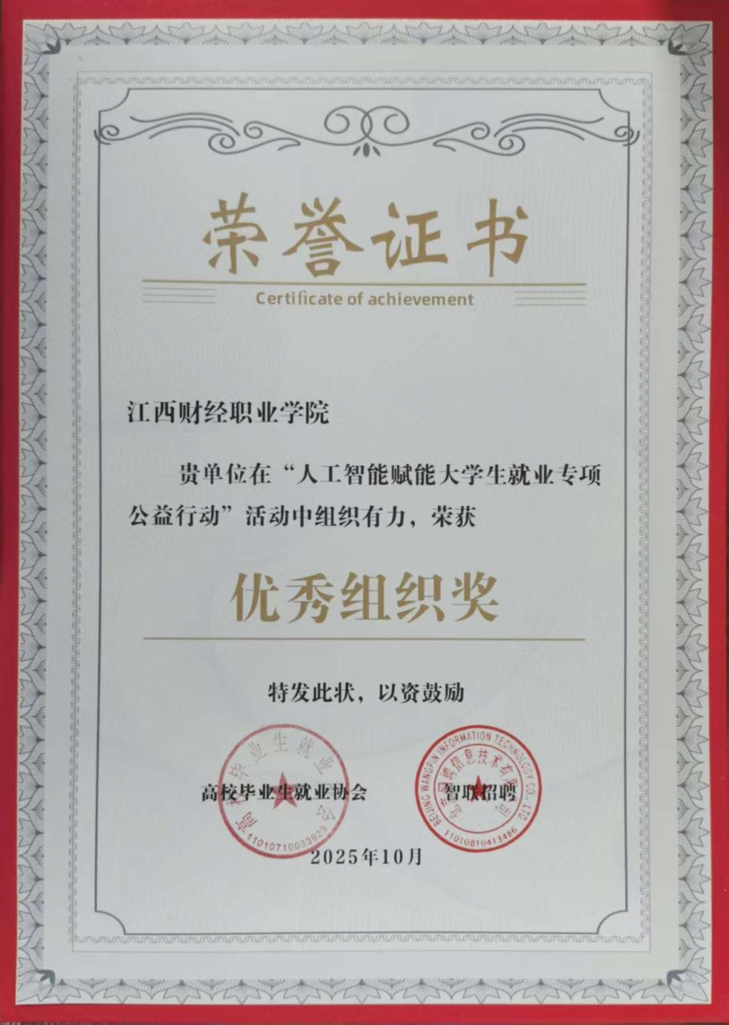 近日,在由高校毕业生就业协会与智联招聘联合主办的“人工智能赋能大学生就业专项公益行动”中,今年会凭借出色的组织工作与积极的育人实践,荣获“优秀组织奖”。该奖项是对今年会在人工智能时代背景下,创新就业服务模式、扎实推进学生就业工作的充分肯定。