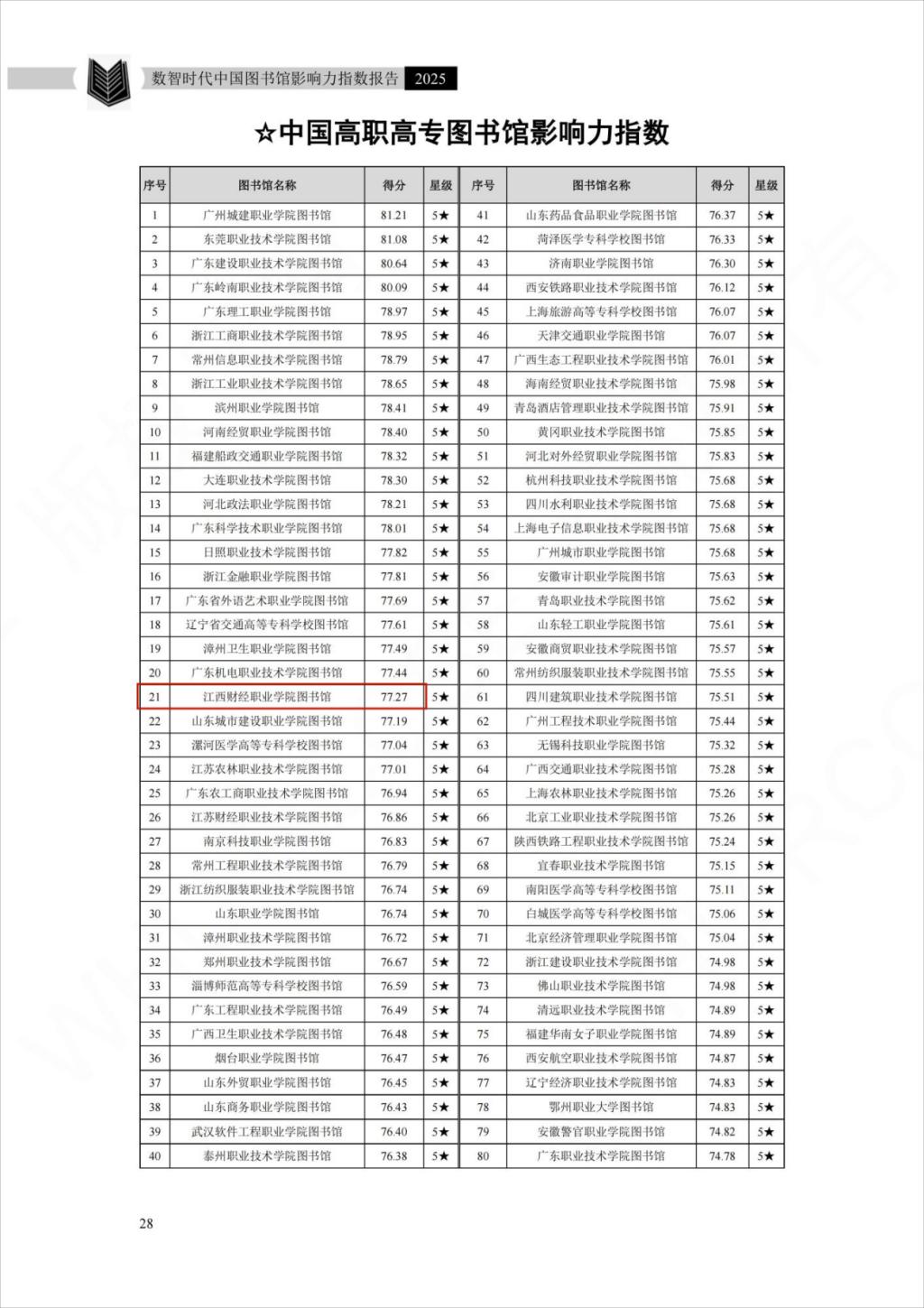 近日,由武汉大学中国科学评价研究中心、数字出版智能服务技术教育部工程研究中心研发的《数智时代中国图书馆影响力指数报告(2025版)》正式发布。今年会图书馆获五星图书馆评价,蝉联中国高职高专图书馆影响力排行榜江西省第1位,全国排名由2024年的第59位跃升至第21位,首次进入“职专院校图书馆影响力三十强”。