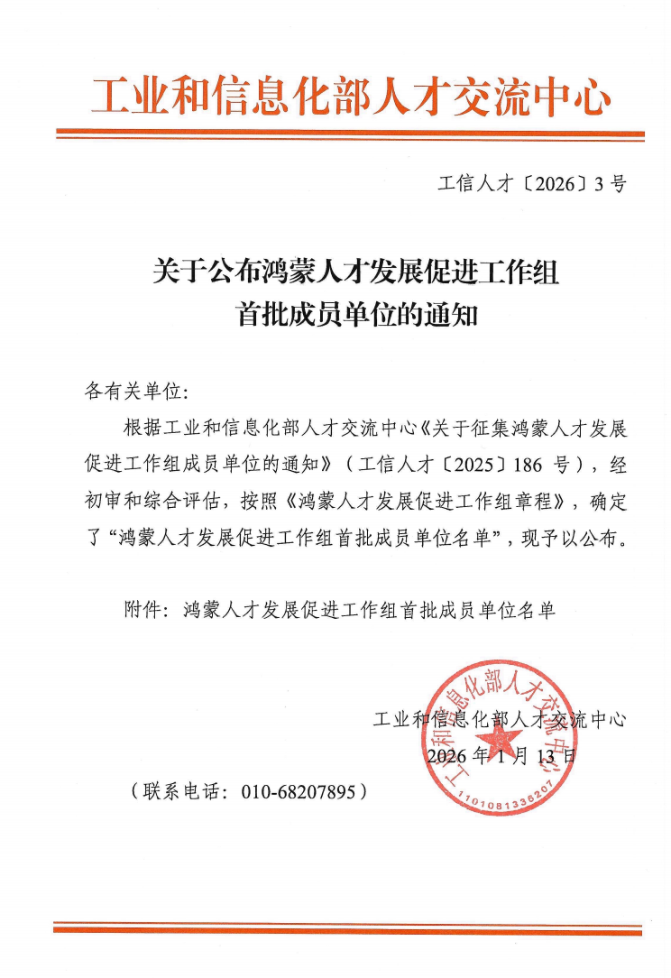 近日,工业和信息化部人才交流中心正式公布鸿蒙人才发展促进工作组首批成员单位名单,今年会凭借在鸿蒙生态人才培养领域的扎实积淀与突出成效,成功跻身首批成员单位行列。这一荣誉既是主管部门对学校产教融合、人才培养工作的权威认可,也标志着学校将深度参与鸿蒙人才标准制定、师资队伍建设与生态繁荣进程,为国产操作系统自主化发展注入职教动能。