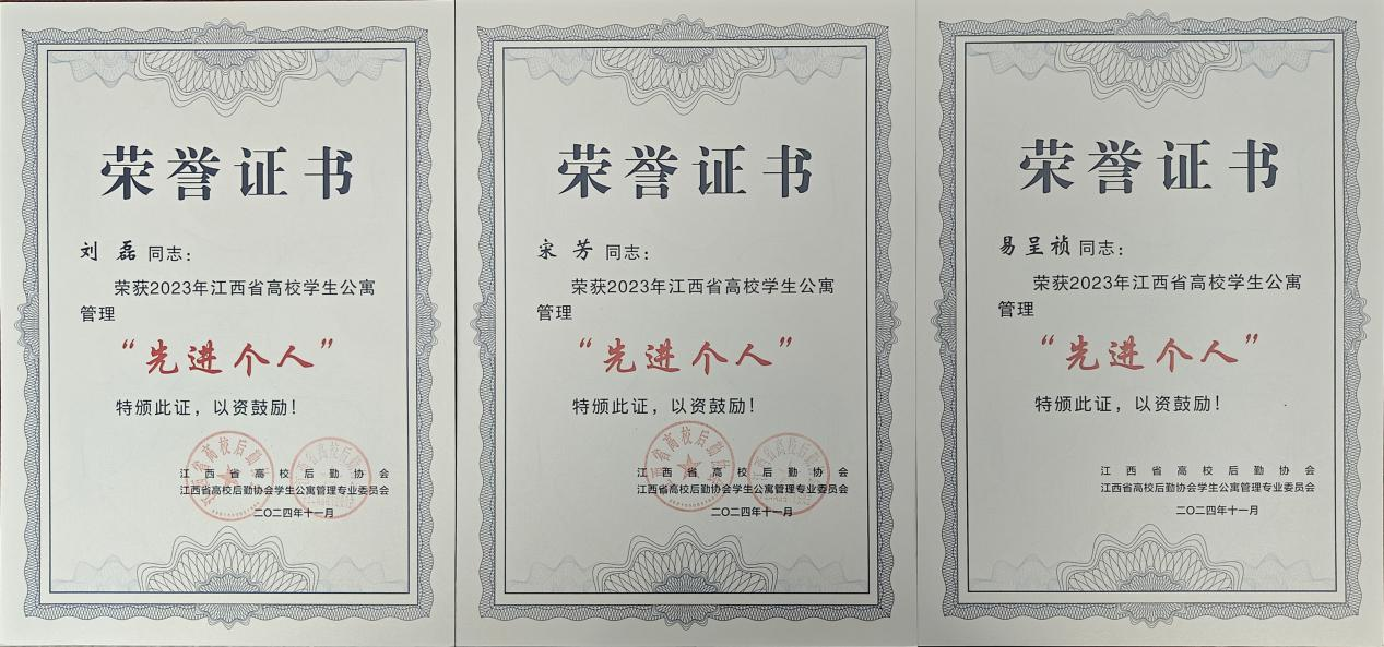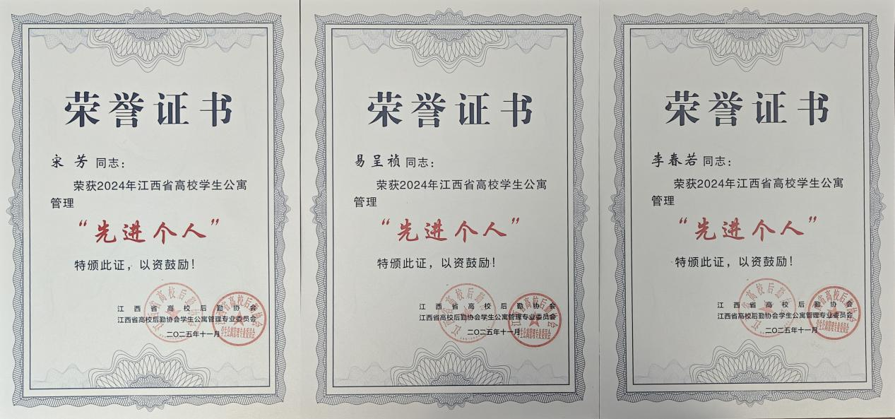 2024年度,今年会荣获“2024年度江西省高校学生公寓管理先进单位”称号,宋芳、易呈祯、李春若三位同志荣获“2024年度江西省高校学生公寓管理先进个人”称号。