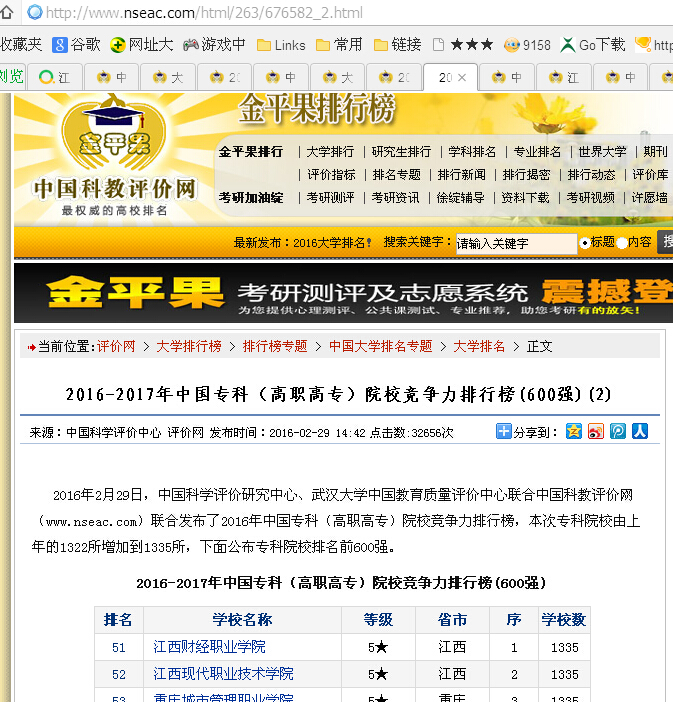 2016年2月29日,中国科学评价研究中心、武汉大学中国教育质量评价中心联合中国科教评价网(www.nseac.com)联合发布了2016年中国专科(高职高专)院校竞争力排行榜。今年会竞争力为5星级(最高等级),在全国1335所高职高专院校中排第51名、江西省第1名。