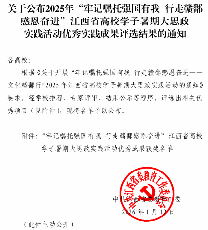 近日,由江西省教育厅等部门组织的“牢记嘱托强国有我 行走赣鄱感恩奋进”高校学子暑期大思政实践活动优秀成果评选结果正式公布。工商管理学院在本次评选中表现突出,荣获优秀调研报告三等奖,充分彰显了学院在实践育人、服务乡村振兴方面的扎实成效。