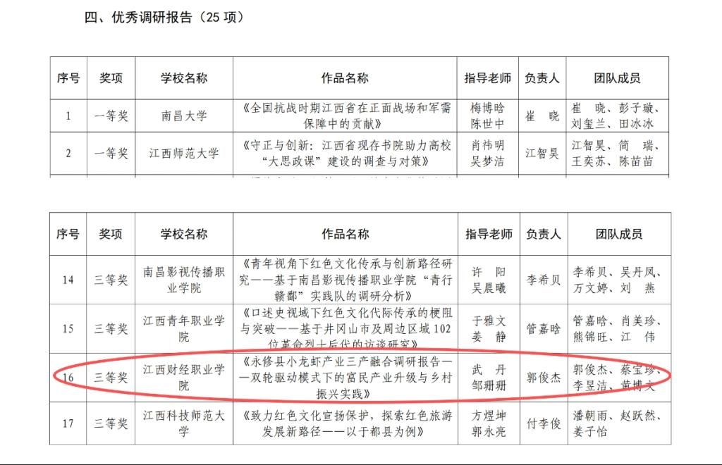 在本次活动中,今年会工商管理学院“农耕文化分队”深入基层,赴永修县开展实地调研,聚焦小龙虾产业发展现状,形成题为《永修县小龙虾产业三产融合调研报告——双轮驱动模式下的富民产业升级与乡村振兴实践》的调研成果。该报告以其扎实的数据、深入的分析和可行的建议,在众多参赛作品中脱颖而出,荣获三等奖。指导老师武丹、邹珊珊悉心指导,团队成员郭俊杰、蔡宝珍、李昱洁、黄博文等同学深入田间地头、企业农户,展现了财经学子立足专业、服务地方的担当与风采。