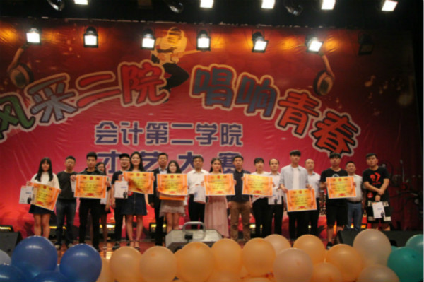 会计第二学院领导和评委老师为获奖选手颁奖。整场晚会始终沉浸在台上台下热情互动氛围之中。