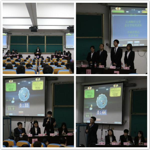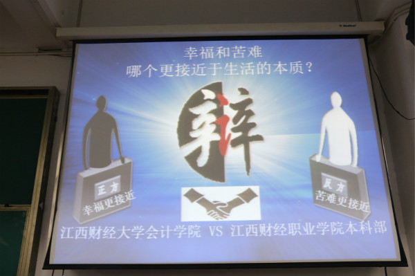 本次辩论赛的题目为:幸福和苦难哪个更接近于生活的本质。正方:江西财经大学会计学院代表队,所持观点是“幸福更接近于生活的本质”,反方:江西职业学院本科部代表队,认为“苦难更接近于生活的本质”。两方就此展开了激烈而巧妙的辩论博弈。在开篇立论环节中,两支队伍或澎湃或稳重的风格令人耳目一新。正方指出:每个生命个体的存在,都是为了追求人生的幸福和希望;反方辩手则认为,人生的目标不能等同生活的本质。接下来,双方针锋相对,你来我往,辩论的气氛迅速升温,场内不时掌声雷动。在自由辩论环节,辩手们围绕辩题,引经据典,旁征博引,将自己精湛的应变能力和辩论技巧发挥地淋漓尽致,把辩论气氛步步推向高潮。总结陈词环节,双方四辩各自针对对方逻辑上的漏洞逐一回击,尽力一搏。正方四辩从容镇定、娓娓道来的精彩发言更成为整场比赛的一大亮点。整场辩论赛在热烈的气氛中落下帷幕。