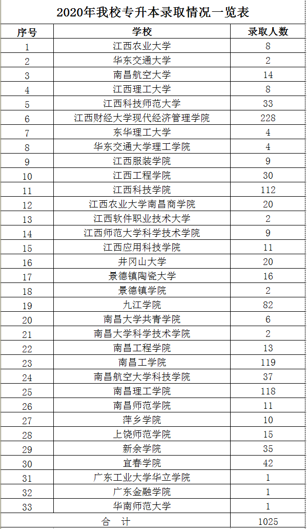 jinnianhui今年会2020年参加专升本考试的毕业生1057人,最终被江西农业大学、华东交通大学、南昌航空大学、江西科技师范大学、江西财经大学现代经济管理学院等省内各普通本科院校录取共计1025人,录取率高达97%,录取人数和录取率双创历史新高。