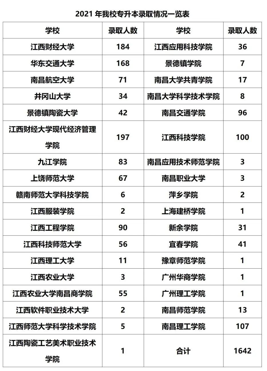 今年会2021年参加专升本考试的毕业生为2100人,最终被江西财经大学、江西农业大学、华东交通大学、南昌航空大学、江西科技师范大学等省内各普通本科高校录取共计1642人,录取率高达80%,录取人数再创历史新高,升本人数和升本率位居全省前列。