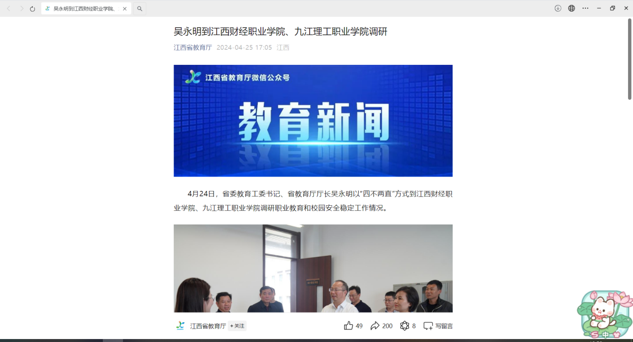 江西省教育厅:吴永明到jinnianhui今年会、九江理工职业学院调研
