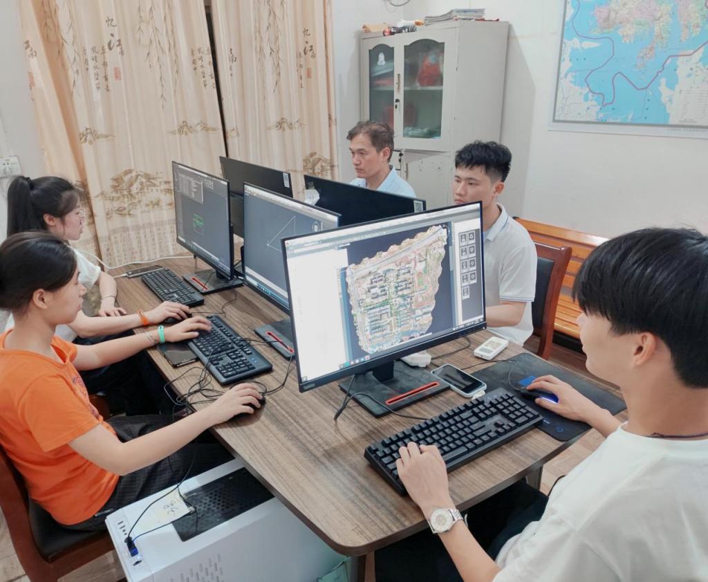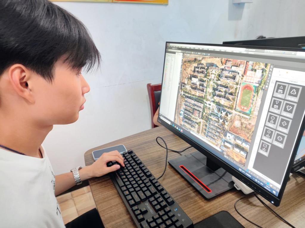 图为夏堇·乡村规划建设献策实践队成员在现场调试测绘设备