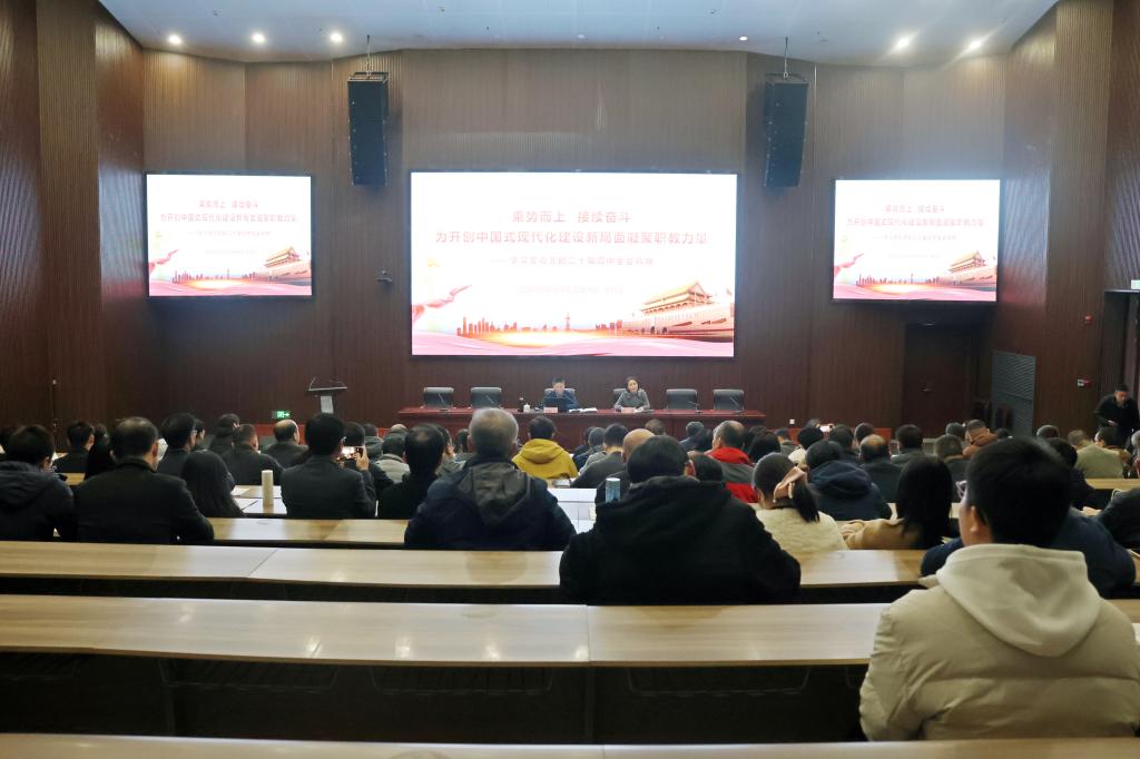 李松志书记的宣讲报告以“‘乘势而上 接续奋斗’为开创中国式现代化建设新局面凝聚职教力量”为题,从“十四五”时期我国经济社会发展的重大成就、“十五五”时期经济社会发展的战略部署、实现“十五五”时期发展规划的根本保证、践行新时代新征程高等职业教育的使命担当等四个方面,系统解读了党的二十届四中全会精神核心要义,阐明了职业教育助力强国建设的路径。
